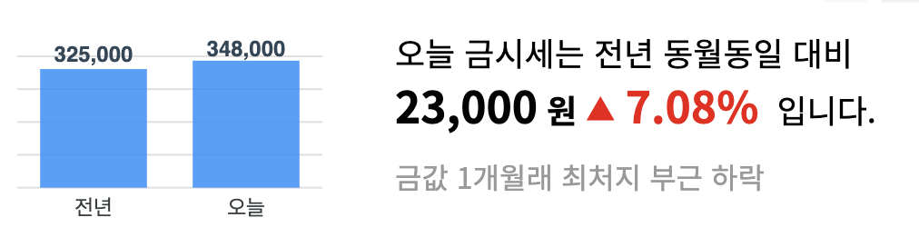 오늘 금 시세는 전년 동월동일 대비 23,000원 7.08% 상승했습니다. 금 값이 1개월래 최저치 부근 하락한 것으로 보입니다.