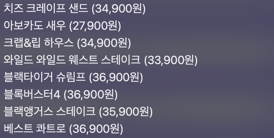 - 사이드디시 리스트 : 불고기 대파 크림치즈 파스타, 체다 치즈 치킨, 칙볼(치킨볼) 파스타, 웨스턴 핫 윙, 허니&갈릭 윙스,