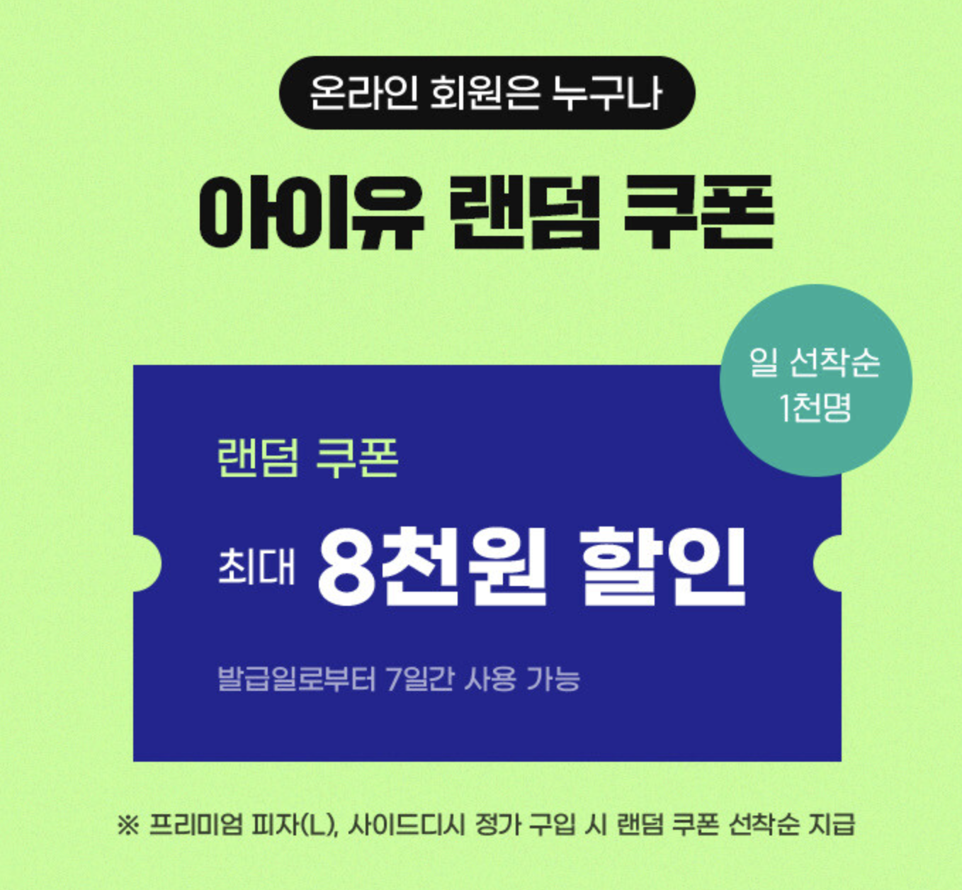 도미노피자의 새 얼굴로 발탁된 광고모델은 바로 '아이유'입니다. 그 기념으로 도미노피자는 '아이유를 찾아라' 라는 이벤트를 진행중입니다. 온라인 회원은 누구나 아이유 랜덤 할인쿠폰을 발급받을 수 있으며, 이는 6천원, 7천원, 8천원으로 구성되어 있는 랜텀 할인쿠폰입니다. 하루에 선착순 1천명만 다운받을 수 있으며, 프리미엄 피자 라지 사이즈와 사이드디시를 정가로 구입시 랜덤 쿠폰을 선착순으로 지급합니다.