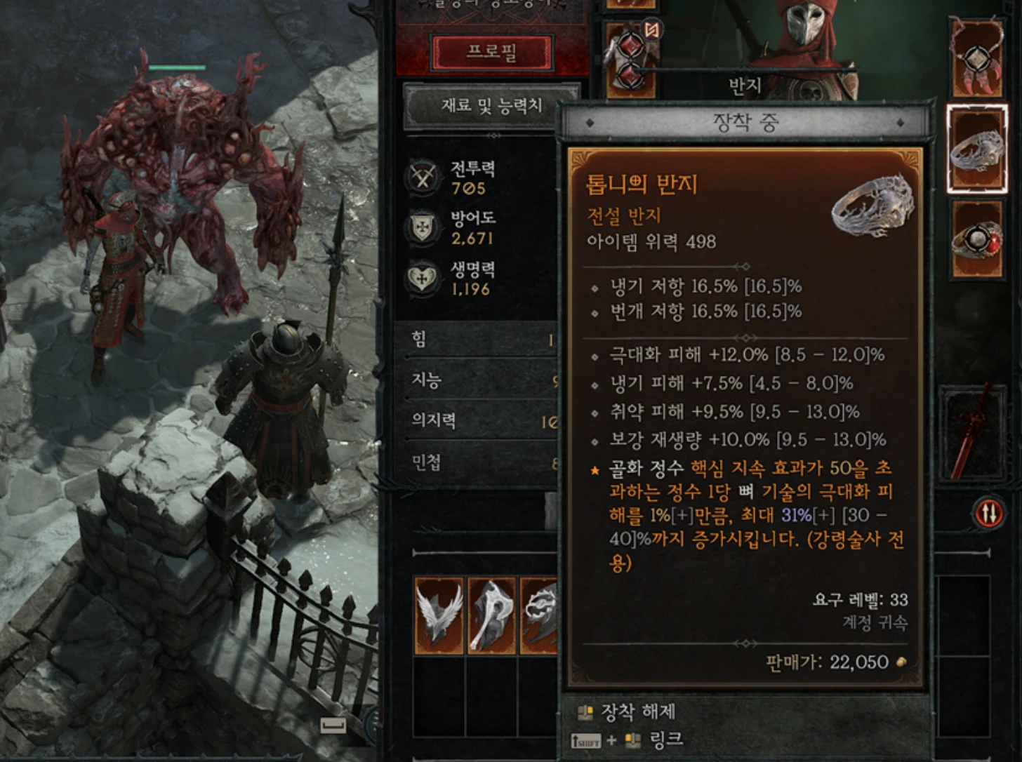 이러한 단순한 운영과 뼈 창 자체 화력이 강하여 별다른 전설템이나 위상이 없어도 캠페인을 끝내는 것이 가능합니다. 이번 디아블로4에서의 육성이나 아이템 세팅은 50렙 이후부터라고 해도 과언이 아니며, 초반 구간에서 나오는 전설템은 미련 없이 갈아버리거나 분해하여 재료 수급을 하는 것이 좋습니다.