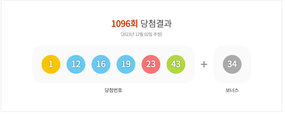로또 1096회차 1등 당첨번호는 1, 12, 16, 19, 23, 43 + 34가 나왔습니다. 노란색 공 1개, 파란색 공 3개, 빨간색 공 1개, 검은색 공 1개, 초록색 공 1개가 출현했습니다.