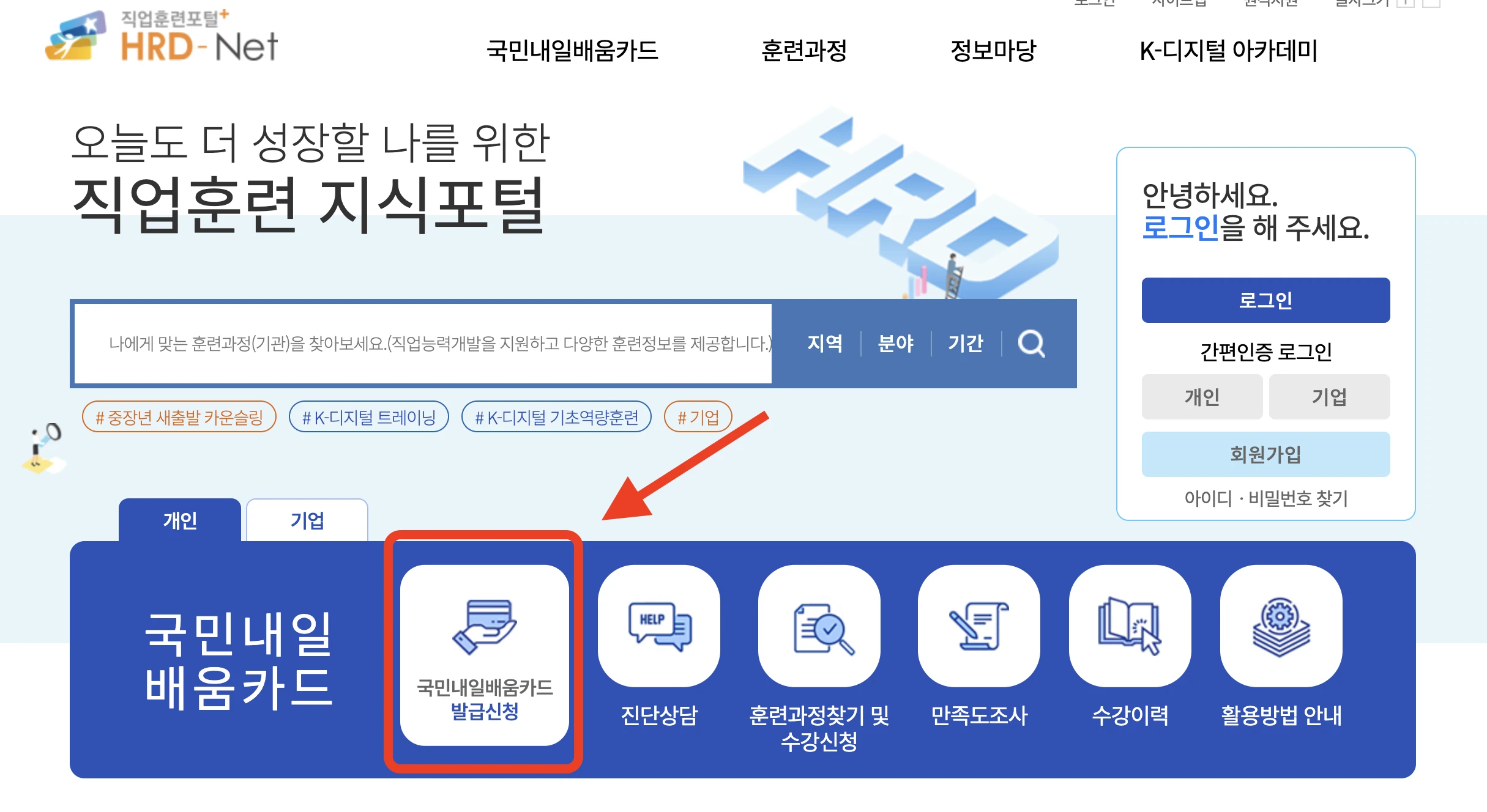HRD-net 직업훈련포털 사이트에서 회원가입을 진행한 후, 국민내일배움을 신청해야 합니다. 신청해서 발급받게 되면 바로 사용이 가능하며, 교육비의 약 30%~50% 정도의 금액을 국비로 지원받을 수 있습니다.