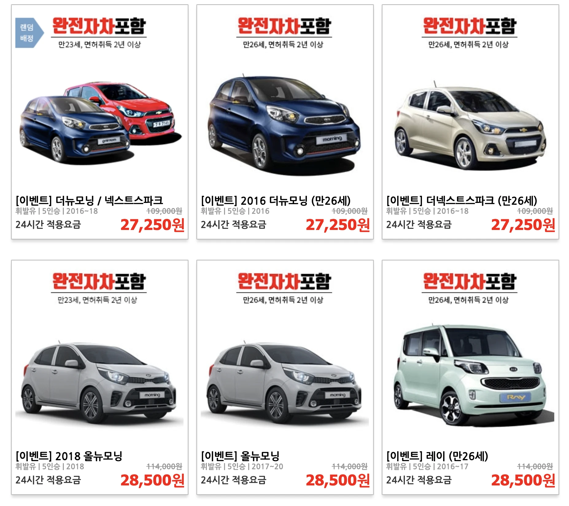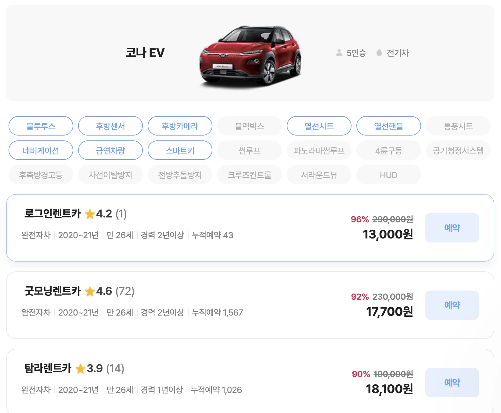 아래 화면을 보시면 추천 최저가 렌트카에서 케스퍼, 소울, 아반떼가 만원 초반인 것을 확인할 수 있습니다. 이것은 예시이며 더 많은 렌트카 차량이 소개되고 있으니 직접 찾아보시길 추천드립니다.