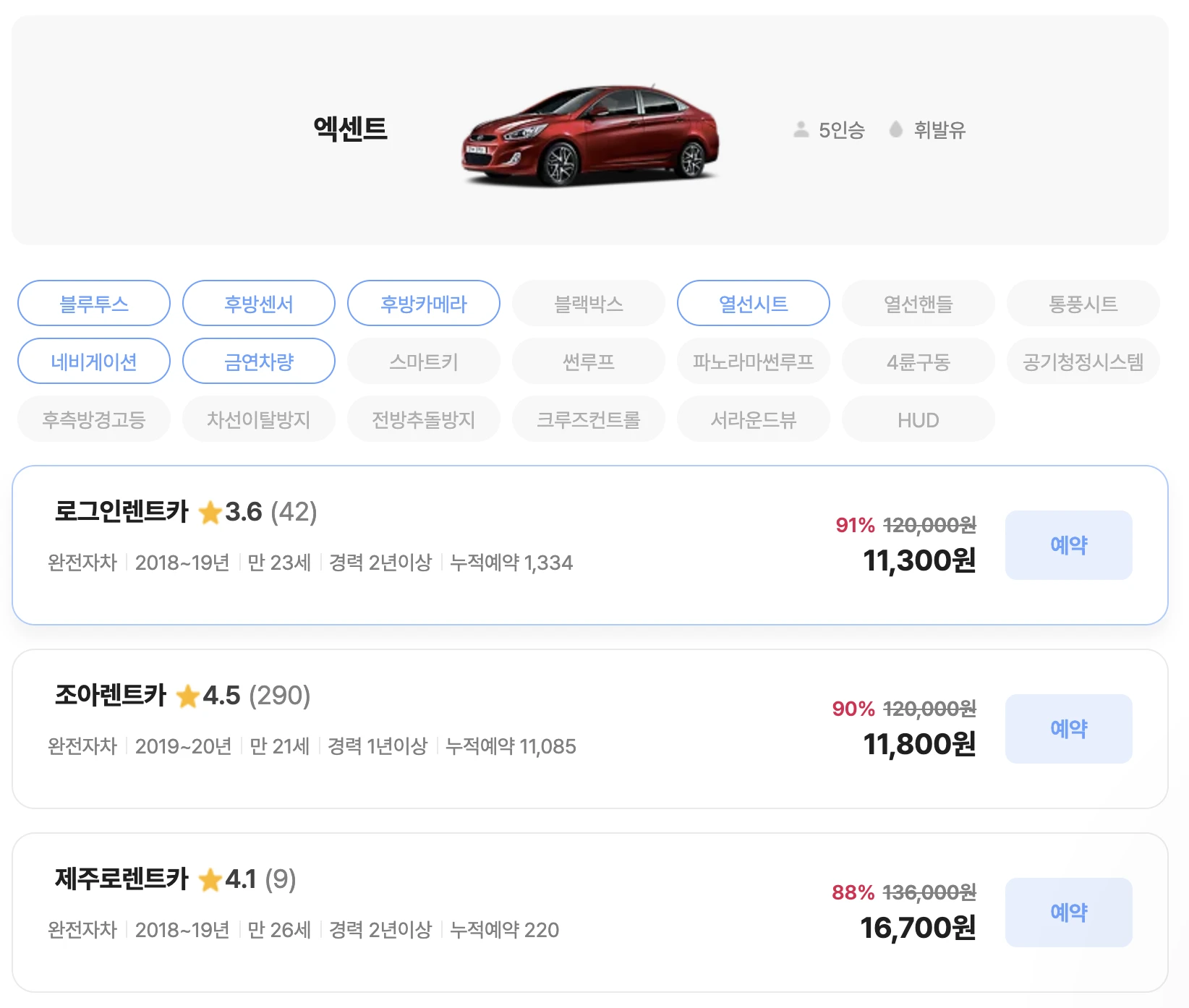 제주도 여행 기간 중 인수일과 반납일을 선택하여 검색하면 렌트카가 차종별로 나뉘어 보입니다.