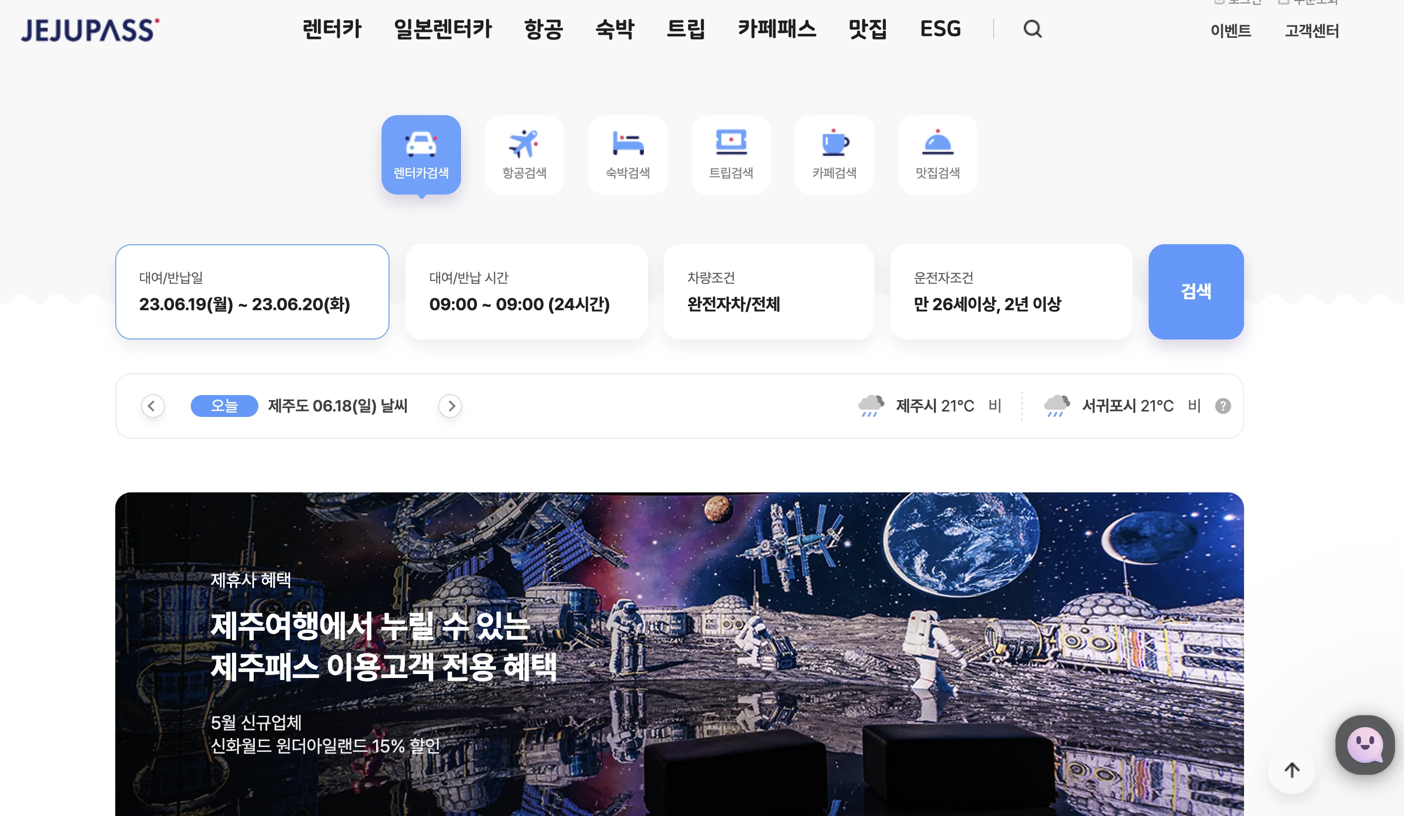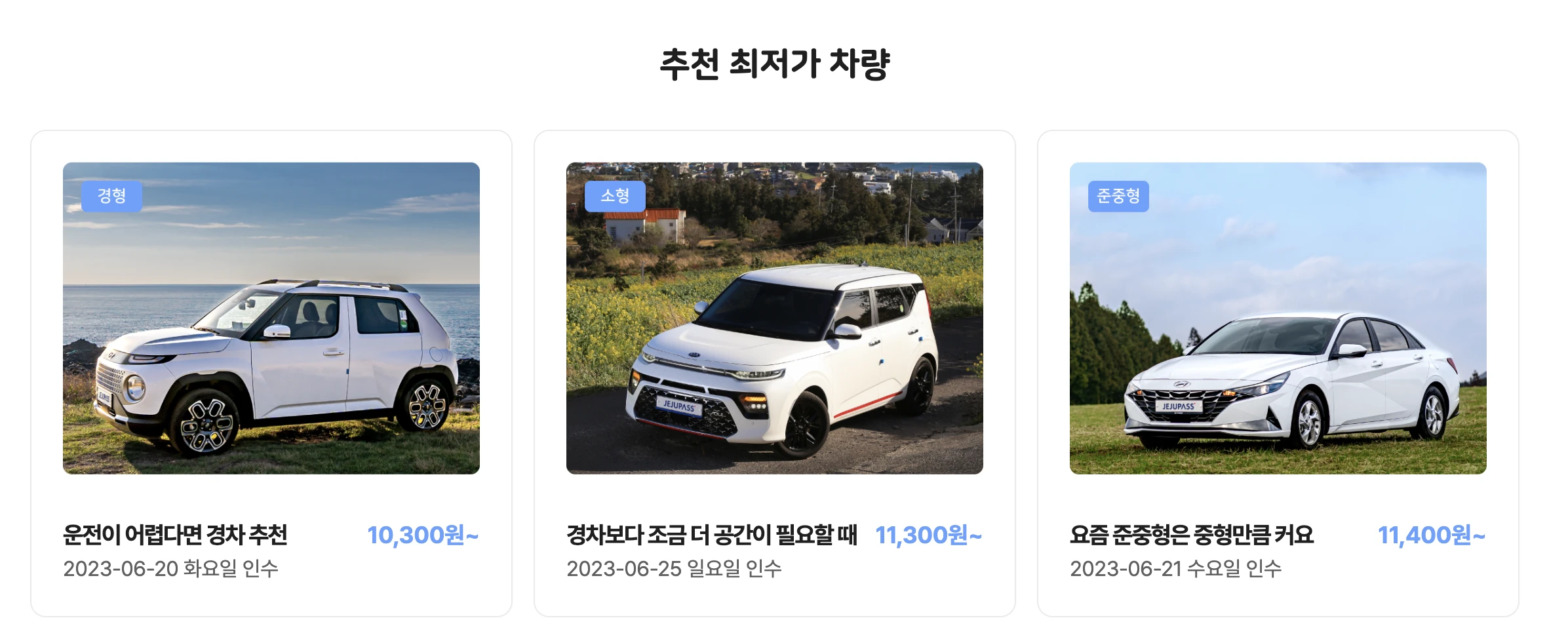 제주패스 홈페이지에 들어가면 첫 화면부터 각 종 이벤트와 추천 최저가 렌트카 차량을 보여줍니다. 참고로 저는 이번 제주도 여행 때 제주패스를 이용하여 렌트카를 아이오닉 5로 3일 이용하는데 총 4만원 들었습니다.