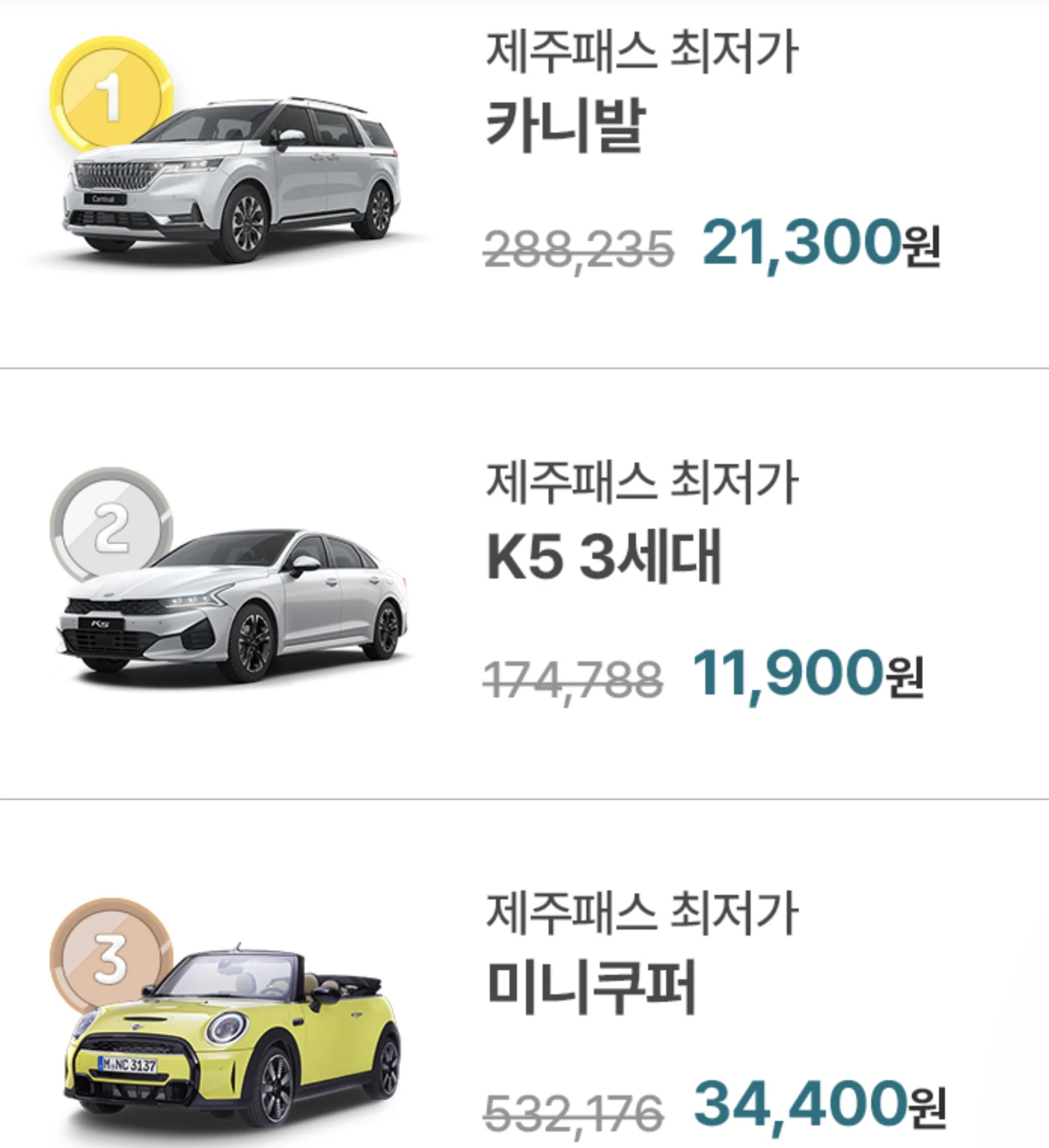 아래 화면을 보시면 추천 최저가 렌트카에서 케스퍼, 소울, 아반떼가 만원 초반인 것을 확인할 수 있습니다. 이것은 예시이며 더 많은 렌트카 차량이 소개되고 있으니 직접 찾아보시길 추천드립니다.