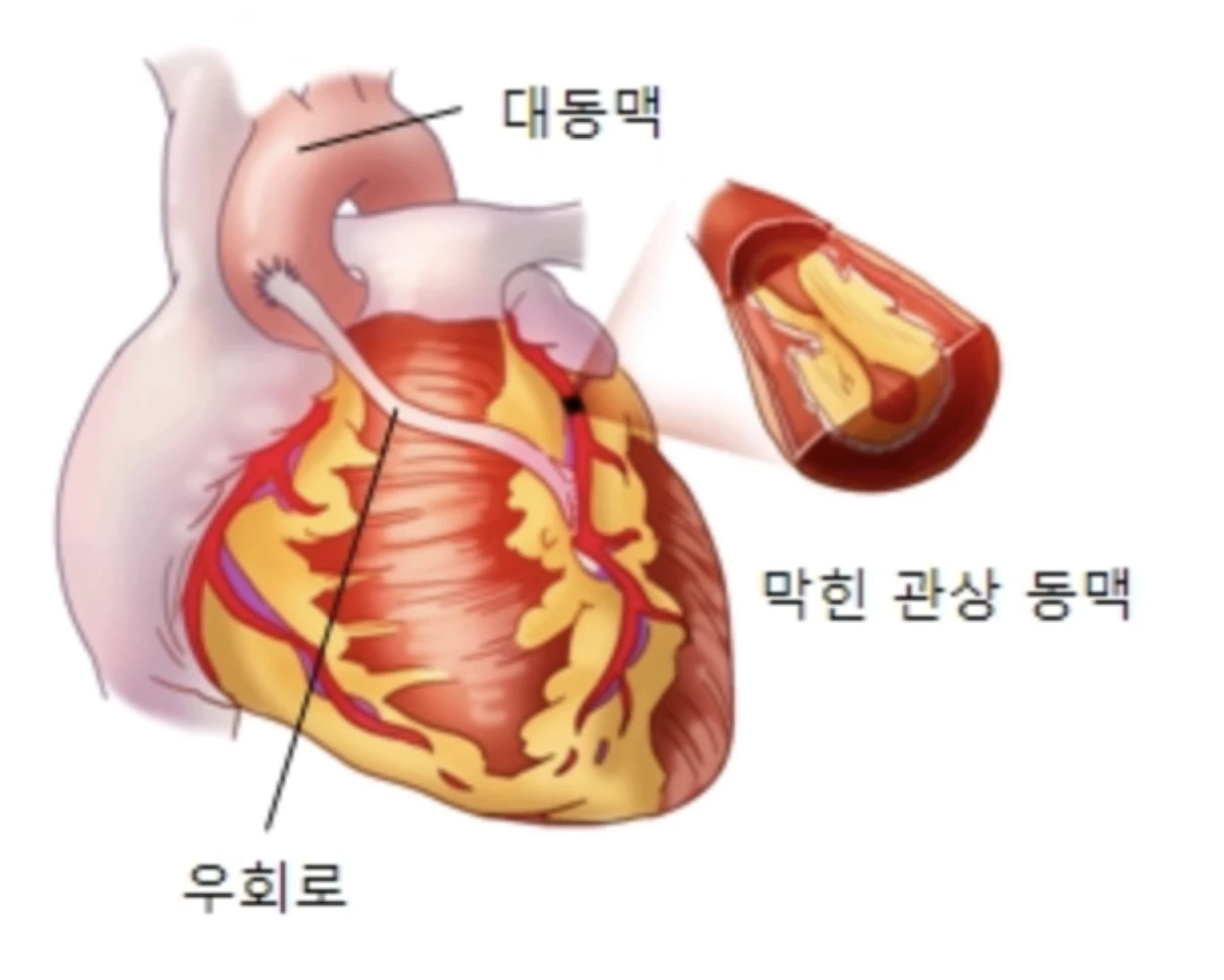 - 심장 근육에 산소와 영양소를 공급하는 관상동맥이 좁아져 심장 근육에 원활한 혈액 공급이 되지 않아 발생하는 질환입니다.