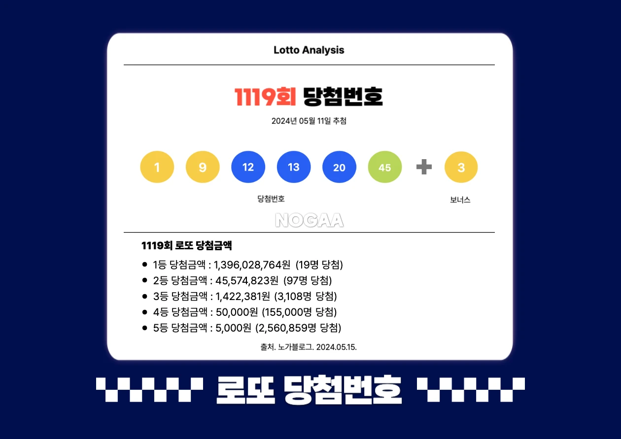 2024년 5월 4일일 로또 1119회 1등 당첨번호는 '1, 9, 12, 13, 20, 45 + 3'이 나왔습니다. 노란색 공 2개, 파란색 공 3개, 초록색 공 1개가 출현했습니다.